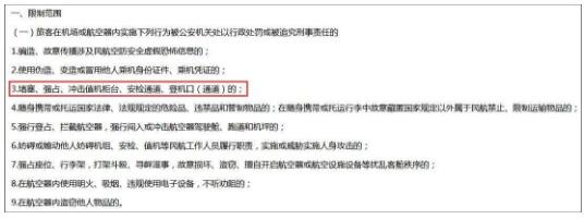 今年4月18日,中国民航局等7个部门联合签署《关于在一定期限内适当限制特定严重失信人乘坐民用航空器 推动社会诚信体系建设的意见》,已于5月1日起施行。规定旅客在机场或航空器内实施9种行为被公安机关处以行政处罚或被追究刑事责任的,将在一年内无法乘坐民用航空器。
