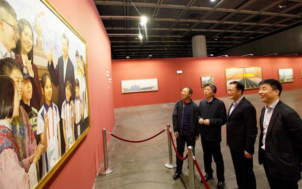 「香港牽動我的心」美術展覽昨舉行預展,圖為中聯辦副主任陳冬(右二)、宣文部部長朱文(右一)、中央美術學院院長范迪安(左二)在預展上參觀《習主席與香港青少年在一起》巨幅畫作,左為作者中央美術學院教授張義波 。