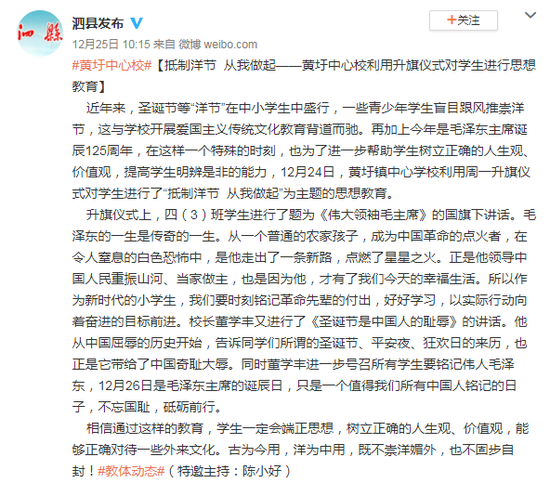 原标题:【抵制洋节从我做起——黄圩中心校利用升旗仪式对学生进行思想教育】
