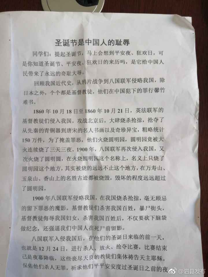 升旗仪式上,四(3)班学生进行了题为《伟大领袖毛主席》的国旗下讲话。毛泽东的一生是传奇的一生。从一个普通的农家孩子,成为中国革命的点火者,在令人窒息的白色恐怖中,是他走出了一条新路,点燃了星星之火。正是他领导中国人民重振山河、当家做主,也是因为他,才有了我们今天的幸福生活。所以作为新时代的小学生,我们要时刻铭记革命先辈的付出,好好学习,以实际行动向着奋进的目标前进。校长董学丰又进行了《圣诞节是中国人的耻辱》的讲话。他从中国屈辱的历史开始,告诉同学们所谓的圣诞节、平安夜、狂欢日的来历,也正是它带给了中国奇耻大辱。同时董学丰进一步号召所有学生要铭记伟人毛泽东,12月26日是毛泽东主席的诞辰日,只是一个值得我们所有中国人铭记的日子,不忘国耻,砥砺前行。