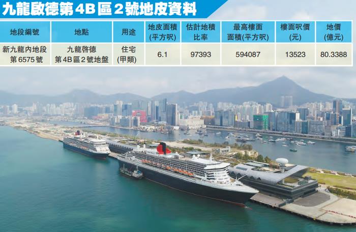據地政總署公告稱,今幅跑道區地皮位於新九龍內地段第6575號,以80.3388億元批予出價最高的中國海外發展。今幅批出的地皮地盤面積約為9.73萬平方呎,最高可建樓面面積約59.4萬平方呎,地皮指定劃作私人住宅用途。此前,市場一般預測地皮總地價介乎86億至93億元,是次中標價較市場下限低約6.9%。