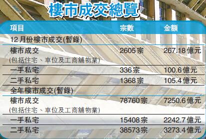 數據顯示,截至12月24日,12月份一手私人住宅買賣合約登記暫時錄得336宗,總值100.6億元,預期整月約有400宗及105.0億元,平均每宗成交成交價為2625萬元。而11月成交宗數為698宗及96.3億元,平均每單成交價為1380萬元。