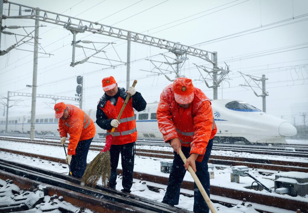 香港段高鐵受內地降雪影響。圖為江西南昌工作人員清理路軌積雪。 新華社