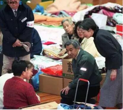 ▲1995年,明仁天皇夫妇在中央体育馆看望并安慰阪神大地震的受灾民众