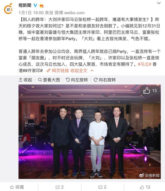 2018年的最后一天,马云现身香港,与香港资本大鳄刘銮雄、恒大集团董事局主席许家印、重庆富豪张松桥等同框出席了一场跨年party。