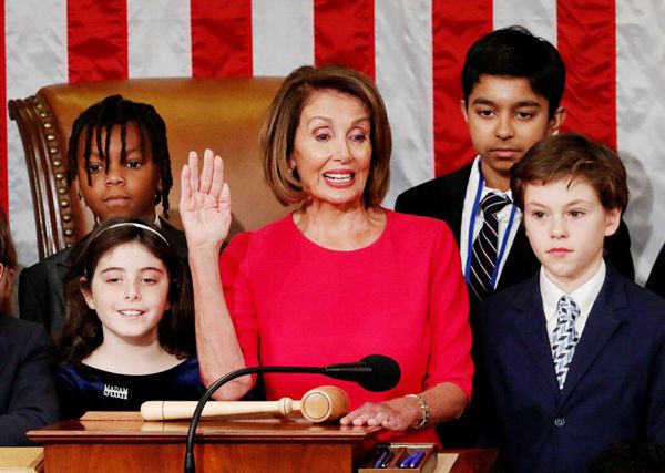 民主黨籍議員佩洛西時隔8年再度出任眾議院議長,她邀請自己的孫子和其他議員的孩子站上講台跟她一起宣誓就職。路透社