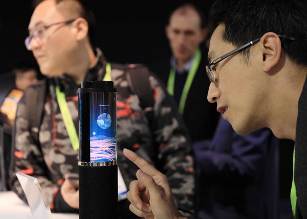 观众体验全球首款可折叠柔性屏手机FlexPai柔派