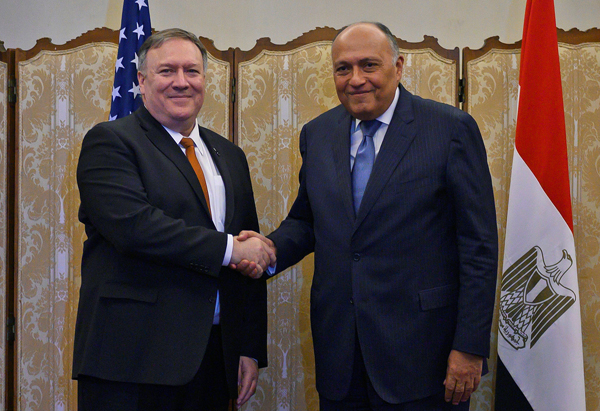 美國國務卿蓬佩奧(左)於當地時間11日訪問埃及時表示,期待朝鮮無核化問題取得重大進展。 路透社