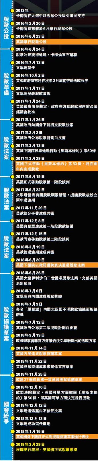 英国于2016年6月就“脱欧”问题举行全民公投,最终决定退出欧盟。2017年3月29日,英国正式向欧盟递交“脱欧”信,正式启动“脱欧”程序。2018年11月,英国与欧盟达成了“脱欧”协议草案。但草案在英国国内议会的通过却受到阻挠。英国议会下院原定于2018年12月11日投票表决“脱欧”协议,最终被文翠珊推迟到2019年1月15日。