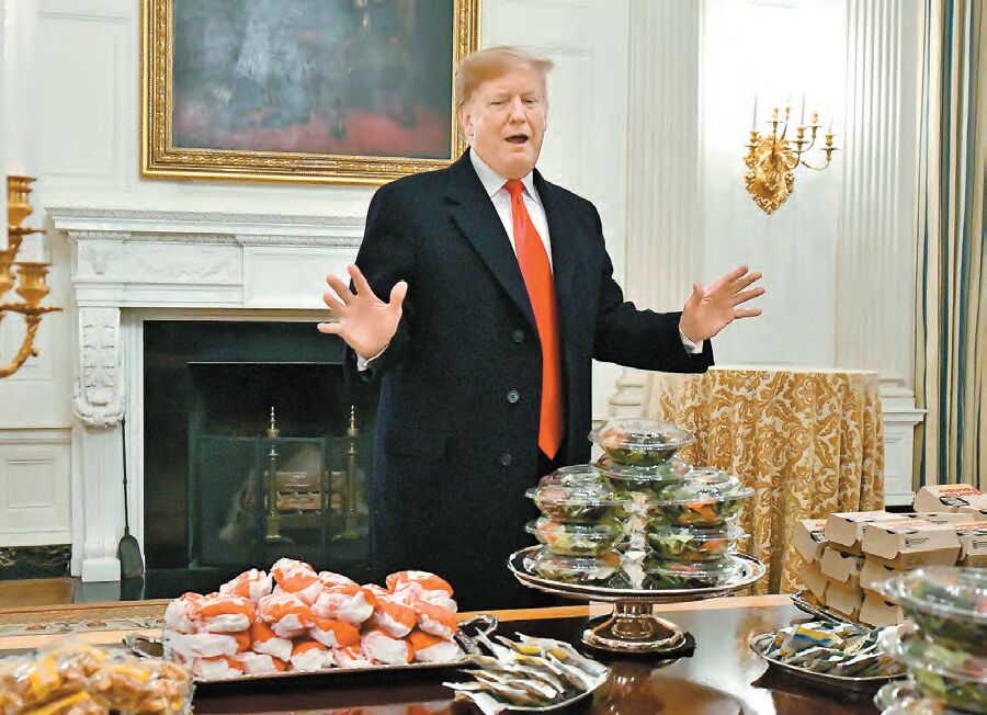由于政府停摆令白宫厨师没有上班,特朗普近日在迎接到访的全美大学橄榄球冠军队克莱姆森大学“猛虎队”成员时,要亲自掏腰包买汉堡包款待宾客。路透社
