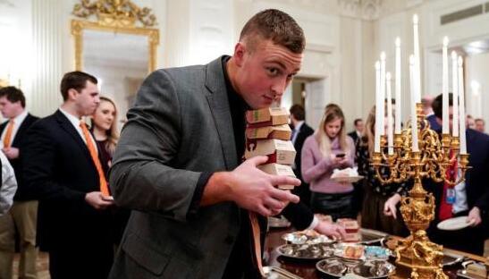 当地时间2018年1月14日,美国克莱姆森大学老虎队获得NCAA大学橄榄球联赛全国总决赛冠军后,特朗普在白宫设宴举办表彰会。