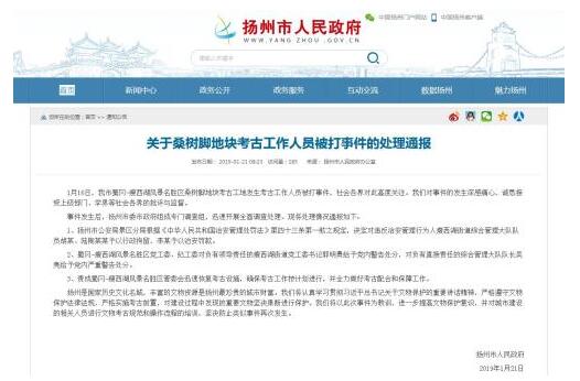 中新网1月21日电 近日,江苏省扬州市桑树脚地块“考古工作人员被殴打事件”引发网络热议。扬州市人民政府网站21日发布通报称,扬州市人民政府对事件的发生深感痛心,诚恳接受上级部门、学界等社会各界的批评与监督。对违反治安管理行为人瘦西湖街道综合管理大队队员胡某、陆陶某某予以行政拘留,李某予以治安罚款。