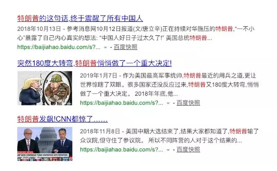 如果我们搜索重要的人物呢?比如特朗普。你会发现,第1页的结果分别是:百度百科、百度贴吧、百家号、百家号、百家号、百家号、新浪、百家号、百度百科。