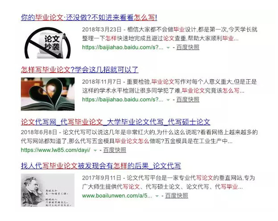 如果我们想学习呢?试试搜索“怎样写毕业论文”,猜猜搜索结果是怎样?一上来就是两条论文代写广告,然后是百家号、百家号、百家号,然后是两个论文代写网。