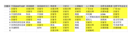 总结一下我的实验结果,黄色背景是百度自家内容或广告: