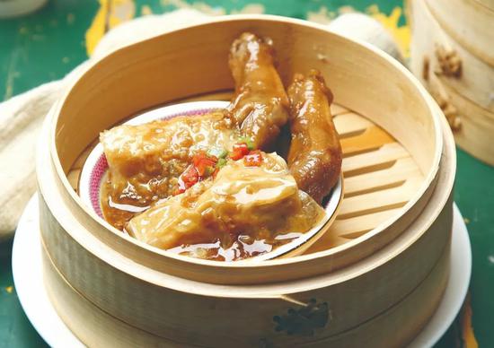 鲍汁鸭脚扎:这是一道因为工艺复杂而被许多餐厅放弃的经典港式点心,出自有40年掌厨经验的谭师傅。鸭掌先用白卤水浸泡入味,再用腐皮把炸过的芋头条和调制好的肉馅包裹好,老抽上色,淋上自制鲍汁蒸煮。一口下去,吃到的是老香港味道。