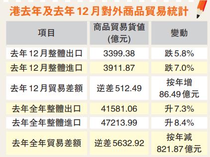 本港出口繼去年11月按年下跌0.8%後,12月跌幅進一步擴大至5.8%,但去年全年出口仍按年上升7.3%。同時,全年進口亦上升8.4%,錄得有形貿易逆差5633億元,相等於商品進口貨值的11.9%。按季度看,去年第4季出口按季下跌3.2%,進口則下跌5.1%。