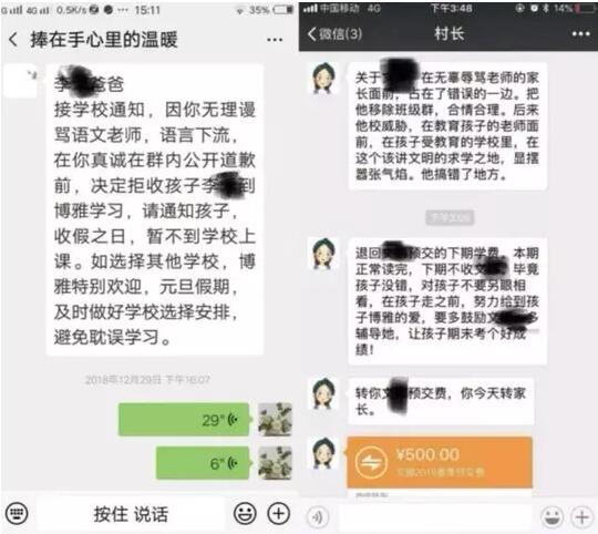 之后,李青的爸爸被告知:“因你无理谩骂语文老师,语言下流,在你真诚在群里道歉前,决定拒收孩子李青到博雅学习……收假之日,暂不到学校上课。”文新的爸爸被告知:“李青的爸爸无故辱骂教师,你站在了错误的一边……文新本学期正常读完,下学期学校不收文新,并退还下期的预交费。”