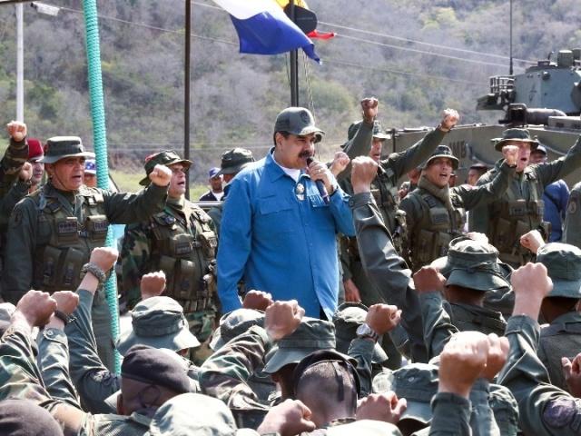 2月3日,委内瑞拉总统马杜罗(中)视察图里亚莫军事基地时发表讲话。