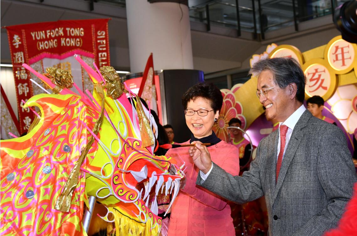 其後,林鄭月娥在署理運輸及房屋局局長蘇偉文、機場管理局主席蘇澤光及行政總裁林天福陪同下,於香港國際機場出席賀年活動,期間與準備離港的市民、抵港的旅客互相祝賀。林鄭月娥也探訪了當值的入境處和海關前線人員,感謝他們在節日期間工作,為農曆新年期間大量出入境市民和旅客提供便捷的服務。