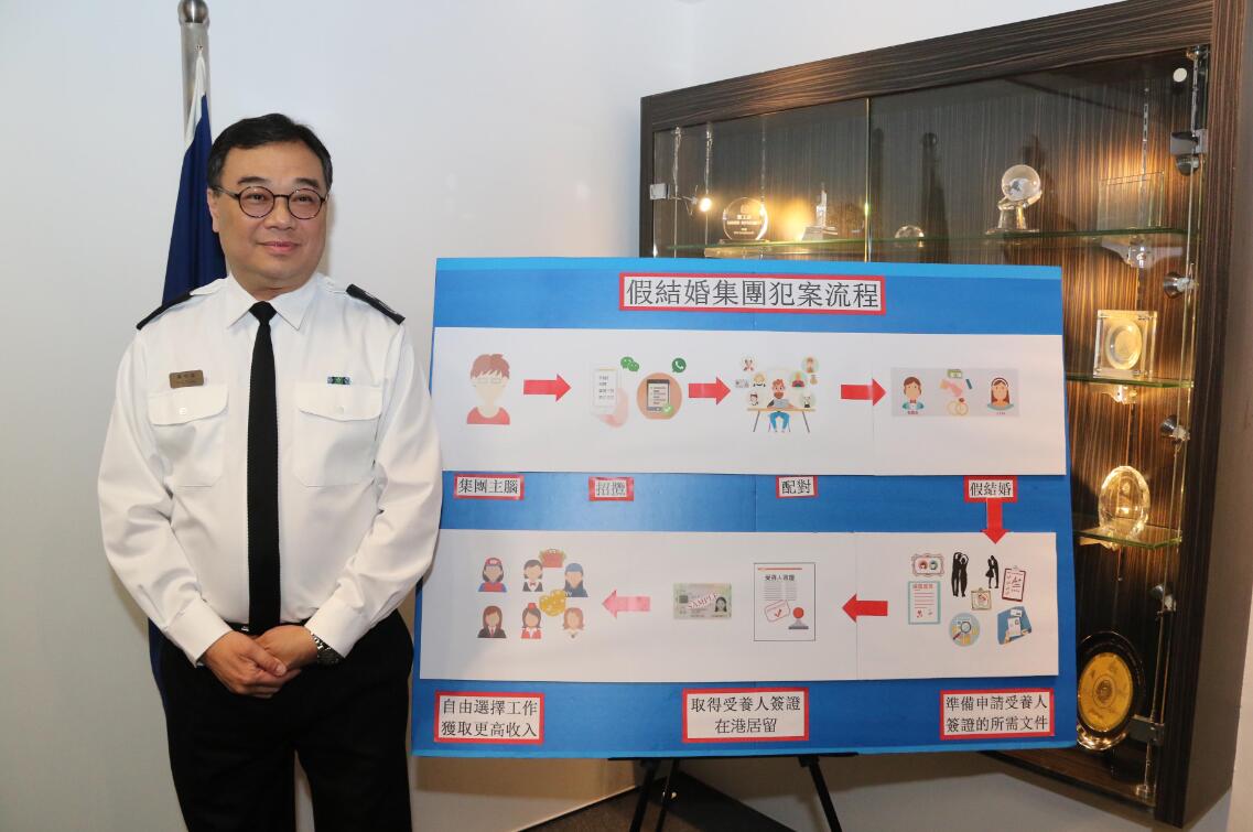 入境處助理處長(執法)馮伯豪表示,案發在2017年3月,當時入境處調查科正調查一宗涉嫌重婚的案件,涉及一名本港男子和一名內地女子,期間2人向入境處人員承認婚姻是虛假,是透過一犯罪集團安排。但當時無法提供犯罪集團的資料,只是在涉案內地女子的手機中,發現一張該集團主腦的相片,人員憑該張相片中人穿的保安員制服和背景,鎖定主腦曾在九龍區一商場任職保安員,從而確定其身份。經追查在2個月後將其拘捕,在其寓所中找到大量虛假結婚的文件,當中有本港居民的身份證副本、內地居民通行證副本、家庭傭工的外國護照副本和結婚證書、帳簿、租約等文件,同時搜獲手機和記憶卡,在手機中有通訊紀錄和相片。