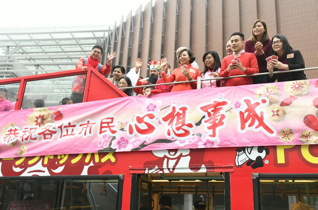 工聯會新春花車巡遊,麥美娟、郭偉強等在花車上向市民揮手拜年。 記者 馮瀚文攝