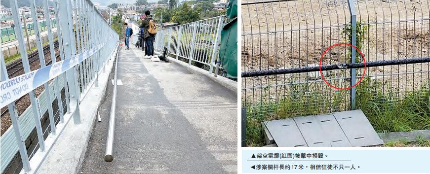 【香港商報网訊】記者區天海報道:港鐵東鐵線太和站附近發生罕見刑事毀壞事件,昨日清晨港鐵開車前工人發現,在大埔大窩東支路九龍坑一行人天橋疑有多名擲物狂徒合力拆下17米長的扶手欄杆,拋擲落天橋擊中架空電纜,引致供電故障,東鐵線服務受阻約1小時,警方到場蒐證,翻看閉路電視錄影,由於欄杆長且沉重,初步相信犯案不只一人;執業律師指,刑事毀壞案最高刑罰可監禁10年。