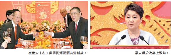 蘇樹輝則代表澳博董事局仝人,衷心感謝各位嘉賓蒞臨晚宴,一起延續這個有超過50年歷史的傳統。他對行政長官崔世安10年來蒞臨指導,並主禮金龍匯演,與民同樂,深表榮幸,亦深深感受到特區政府對本土企業的重視和支持。