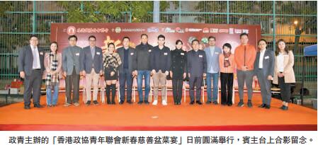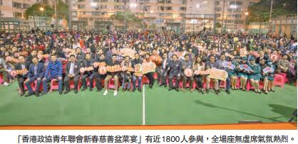 【香港商報网訊】香港政協青年聯會主辦的「香港政協青年聯會新春慈善盆菜宴」日前圓滿舉行,當晚筵開150席,近1800人參與,當中逾半為65歲或以上的長者。活動籌得的善款扣除成本後,全數用作免費款待石硤尾基層人士享用盆菜宴。政青主席譚鎮國表示,政青聚集了一批對服務社會充滿熱誠的年輕人,希望為社會多盡一分力,向大眾傳遞社會關愛的信息,促進跨代共融,維護社會和諧,為香港帶來正能量。