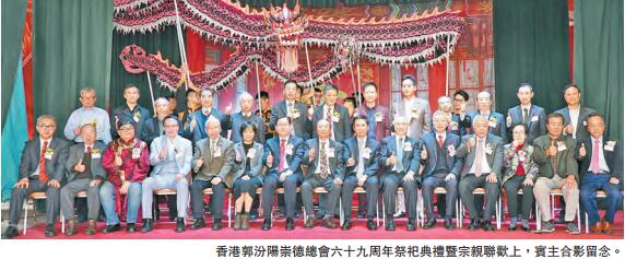 【香港商報网訊】香港郭汾陽崇德總會日前假亞皆老街足球場,舉行第六十九周年盛大祭祀典禮暨宗親聯歡聚餐大會。中聯辦九龍工作部部長郭亨斌、九龍城民政事務專員郭偉勳、九龍城區助理警民關係主任鄺燕婷督察、旺角街坊會理事會主席梁華勝、九龍樂善堂前主席郭予宏、九龍城街坊福利會理事長顧家彥、郭氏功夫金龍醒獅團總教練郭文龍蒞臨主禮,該會理事長郭振忠、監事長郭予祥、副理事郭嘉炎、郭輝文、郭鐘鵬、郭鏡洲、郭錫猛、郭培輝、郭春風、郭雄輝、郭喜龍、郭豫端、副監事長郭啟文、郭仕成、郭秋傑、永遠會長郭隆光、族長郭永清、榮譽會長郭耀明、郭恒達、郭贊樓、郭耀名、名譽會長郭奕喜、顧問郭永昌一同出席接待,更邀請郭氏功夫金龍醒獅團派出金龍表演助興,場面熱鬧。