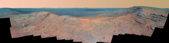 这张照片由美国宇航局的火星探测车“机遇号”上的全景相机拍摄,照片上的景象是2014年夏天,“机遇号”火星探测车沿着奋进陨石坑的西缘向南行驶。