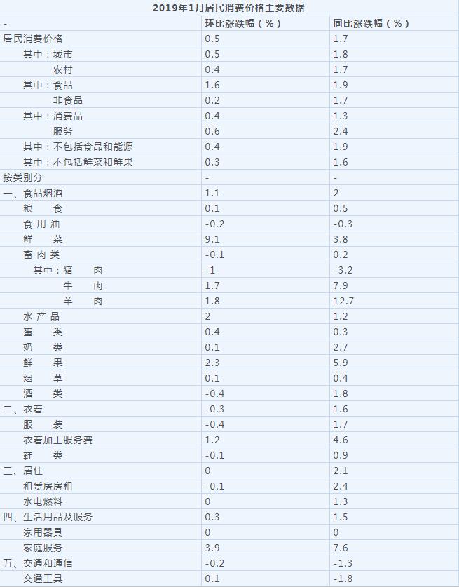 2019年1月份,全国居民消费价格同比上涨1.7%,涨幅创2018年1月以来新低。其中,城市上涨1.8%,农村上涨1.7%;食品价格上涨1.9%,非食品价格上涨1.7%;消费品价格上涨1.3%,服务价格上涨2.4%。