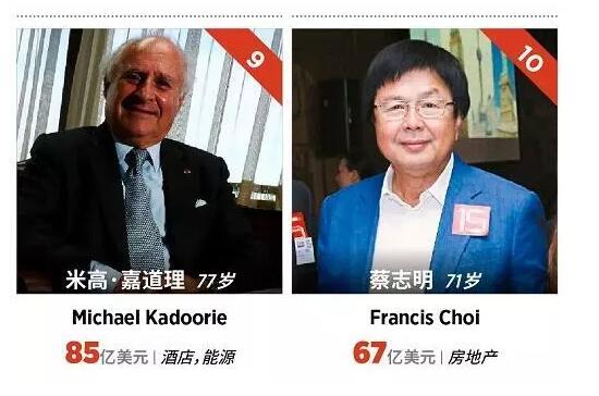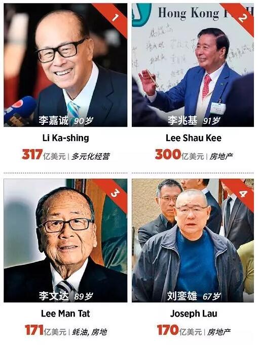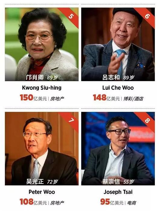 富豪榜当中,华人置业前主席刘銮雄身家170亿美元排第4,新地(0016)大股东“郭老太”邝肖卿身家150亿美元排第5。其后排名依次为银娱(027)吕志和、九仓系吴光正、阿里蔡崇信、中电(002)米高嘉道理、“玩具大王”蔡志明等常客。新上榜的还有有第47位的邱德根后人邱达强,因其持有的富地石油,持有中国燃气(384)19.2%股权水涨船高,令其晋身富豪榜,身家14亿美元。