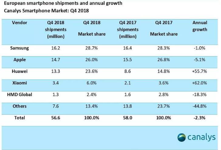Canalys表示,2018年欧洲智能手机出货量的32%(约三分之一)来自中国制造商,其中华为占据了最大份额,在2018年最后几个月占据了逾23%的市场份额。