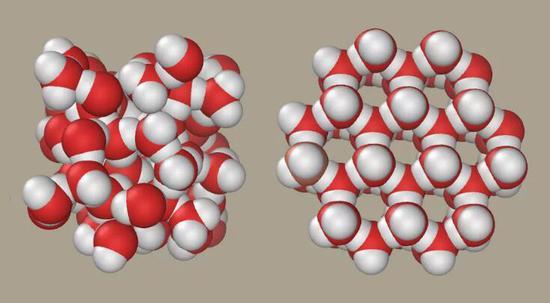 左图中的液态水分子显得杂乱而稠密,而右边的冰分子则显得有序而分散