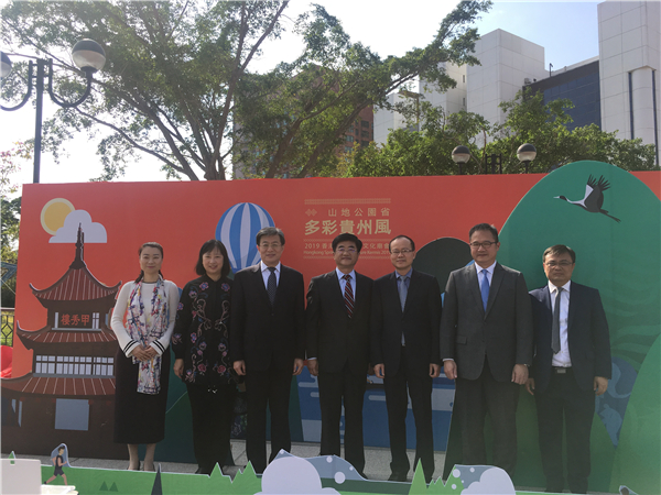 中央人民政府驻香港特别行政区联络办公室副主任杨健(右三),贵州省委常委、宣传部部长慕德贵(右四),中国友好和平发展基金会理事长李希奎(左三),康乐及文化事务署署长、太平绅士李美嫦(左二),贵州省委宣传部副部长、贵州省人民政府新闻办公室主任哈思挺(右一)合影留念。