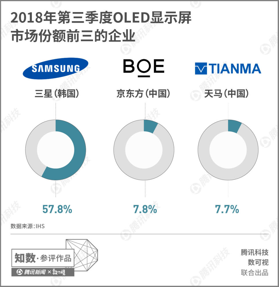 三星在OLED方面主要有A1-A3三条产线。A1目前主要是一条实验线,A2生产平面、柔性OLED面板,A3生产柔性OLED面板。A3工厂产能惊人,每月能生产15000片基板,而且更有将其提升至30000片的计划。IHS2018年第三季度的报告显示,当季度三星的OLED显示屏占据了57.8%的市场份额,遥遥领先中国企业京东方和天马。