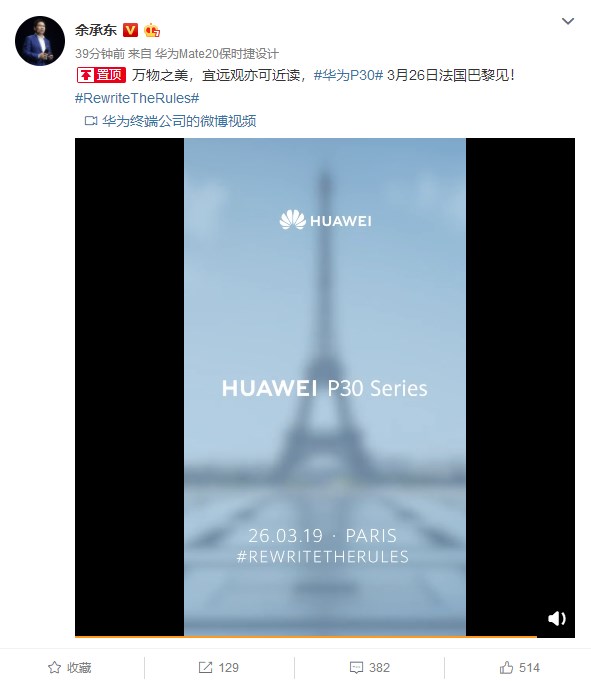 (原标题:华为P30系列正式官宣!3月26日法国巴黎见)