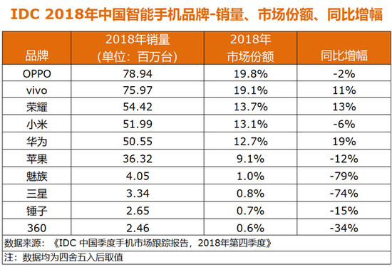 在2018年全年销量榜单中,OPPO、vivo仍以较大优势占据前两位,市场份额均接近20%。华为、荣耀手机和小米销量均超越5000万台,同时跻身TOP5。苹果排名第六位,销量为3632万台,同比降幅12%。