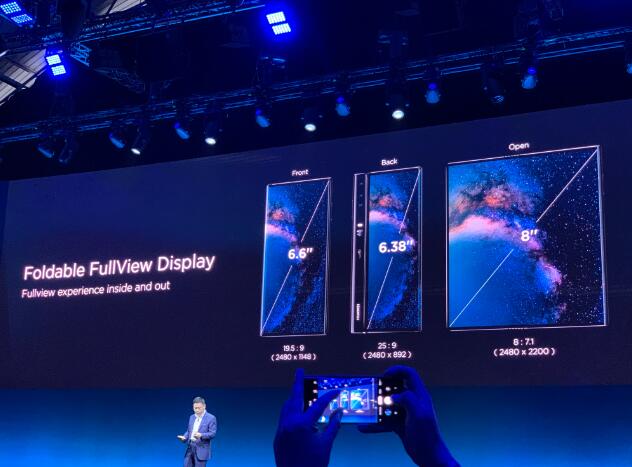 华为Mate X全部打开之后屏幕尺寸达到了8英寸,正面无刘海和开孔。通过铰链设计合上之后屏幕尺寸为6.4英寸,且折叠后的屏幕间几乎没有缝隙。华为Mate X机身厚度为5.4mm,折叠之后厚度为11mm,指纹识别集成在电源键上。