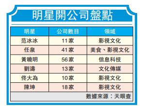 其次,來說說那些遊走在資本市場的明星們。根據《福布斯》2017年明星收入數據,排名前20的內地明星中,有16人合計擁有146家公司。其中持有公司數量最多的是藝人黃曉明,其已連續十多年登上《福布斯》中國名人榜。根據天眼查數據,他手中持有56家公司控制權,其中註冊資本超過3億元的有韓都衣舍和樂視影業兩家公司。投資領域已經涉及影視文化、商貿、投資、科技、醫療、互聯網、餐飲等眾多領域。另外,藝人陳坤、范冰冰及劉濤等三人各自擁有的公司也超過10家。