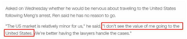 周三被问及孟晚舟被捕后他是否会对前往美国感到紧张,任正非回答说他没有理由去。