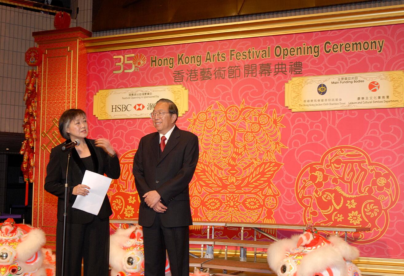 Tisa(左)接任藝術節行政總監後,首次主持第35屆香港藝術節開幕典禮。圖右為當時香港藝術節主席李業廣。