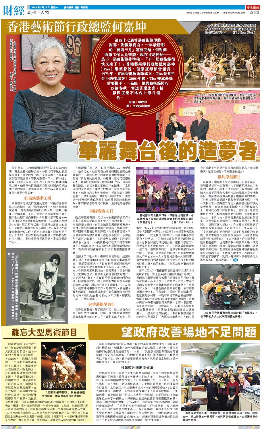 對藝術節而言,資金不足未必是最大難題,場地不夠才是最限制選取節目的因素。雖然近年可作演出的地方多了,例如大館、牛棚等,但場館檔期卻擠得很緊,「可用的場地十分不足,所以不管西九也好、東九也好,希望盡快落成。」土地短缺問題一直困擾香港各行各業,尤其缺乏大型文藝表演場地,未能與國際接軌,Tisa曾在外國見識過一種做法,認為可在香港實行:「外國有歌劇院,下午演芭蕾,晚上做歌劇,翌日又上演另一套歌劇,即是同時由多個演出單位去分享一個舞台,只要後台有足夠位置給幾個團體放布景、道具,就能夠如此運作。」Tisa重申,若政府能投資這種場地,隨時能帶旺旅遊業:「若然能夠上午看歌劇、下午看話劇,晚上看芭蕾,定可以吸引更多旅客來港。」說到新場地,政府不是投放了很多資源到西九文化區嗎?戲曲中心年初也啟用了,但作為西九文化區管理局表演藝術委員會成員的Tisa,卻未有計劃為此多增加戲曲節目,主要是希望場地票務等事項再清晰一點才作考慮。
