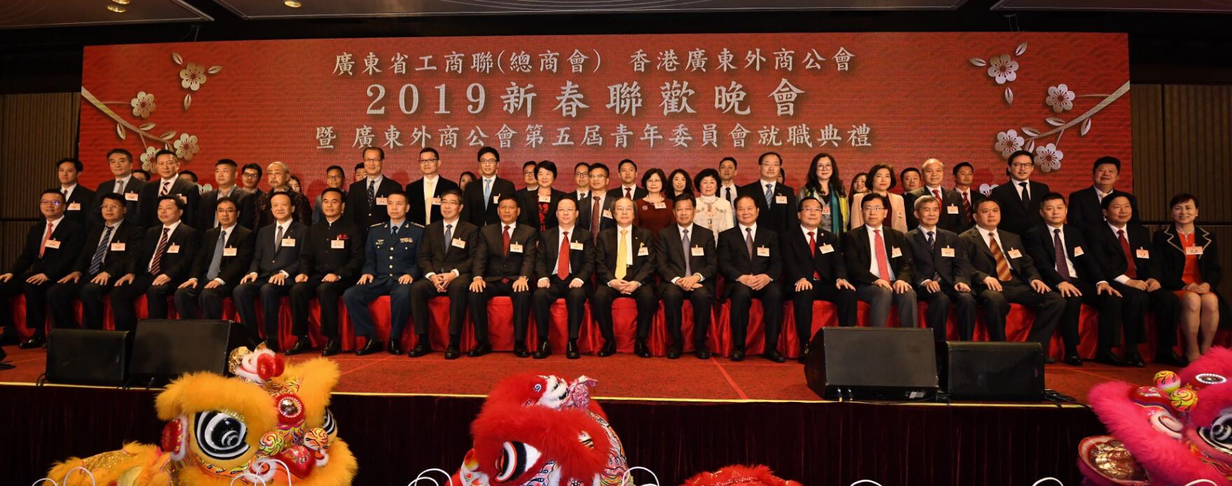 廣東省工商聯(總商會)、香港廣東外商公會舉行「2019新春聯歡晚會暨廣東外商公會第5屆青年委員會就職典禮」,主禮嘉賓合照。