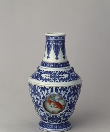 “青花转心瓶”由两部分组成:内瓶和外瓶。也就是说在一个瓶子内,套装另外一个瓶子,并且外瓶和内瓶都有釉彩画面,内瓶在旋转的过程中,我们可以看幻灯片一样,出现很多不同的图案。而“青花转心瓶”的内瓶图案是:活灵活现的金鱼。
