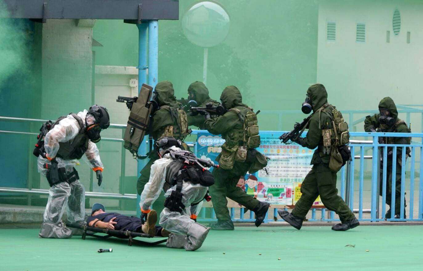 演習模擬恐怖分子投放有害化學氣體後,身穿防化服的警察在現場搜捕。