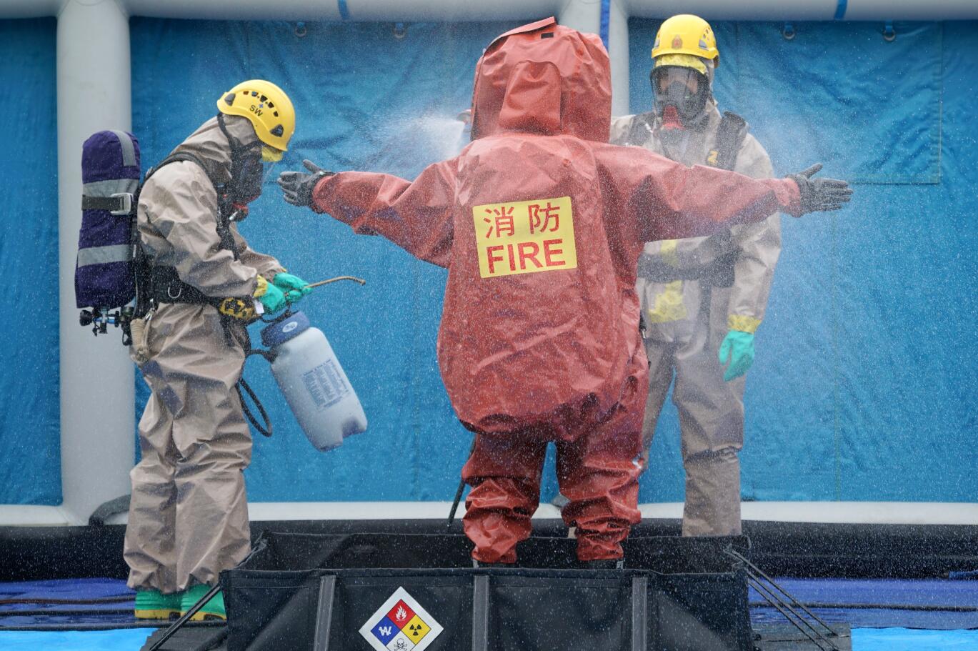 消防處危害物質專隊對消防人員進行洗消處理。
