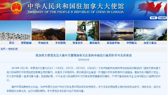 针对中方撤销加相关企业向中国出口油菜籽许可事,中国驻加拿大使馆发言人今天表示,2019年1月以来,中国海关总署先后4次(1月4日、3月1日、3月15日、3月26日)主动向加联邦政府负责检验检疫的职能部门通报在自加拿大进口的油菜籽中发现检疫性有害生物的情况,并提供了详细资料,要求其通知业者进一步调查并切实采取有效改进措施,避免类似问题再次发生。双方技术层面一直保持着沟通。但遗憾的是,中方在进口加油菜籽中仍不断发现疫情截获的情况,不得不撤销加有关企业向中国出口油菜籽的许可。