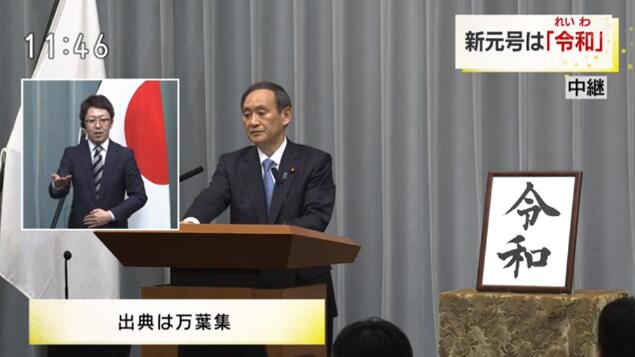 当地时间上午11时40分(北京时间上午10时40分),日本内阁官房长官菅义伟召开记者会,宣布新年号定为“令和”,成为自“大化”以来,日本历史上第248个年号,该年号将于5月1日新天皇即位时进行更换。